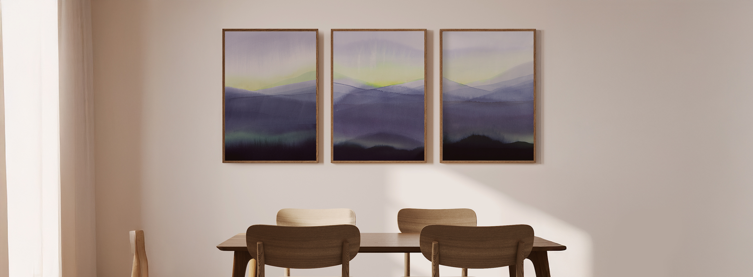 Nous créons ensemble des triptyques à l’encre et en gravure, inspirés par la poésie des paysages de montagne. En mêlant pigments, encres et textures naturelles, nous laissons la pluie, le vent et la lumière guider nos compositions. Imprimé en haute qualité, chaque triptyque ouvre une parenthèse sensible et moderne au cœur de nos inspirations partagées.