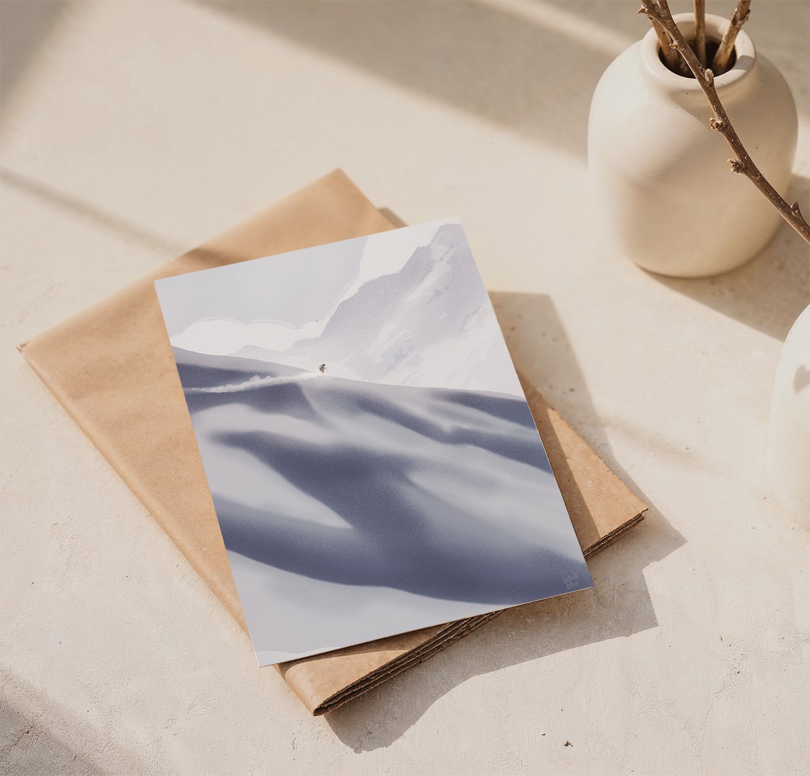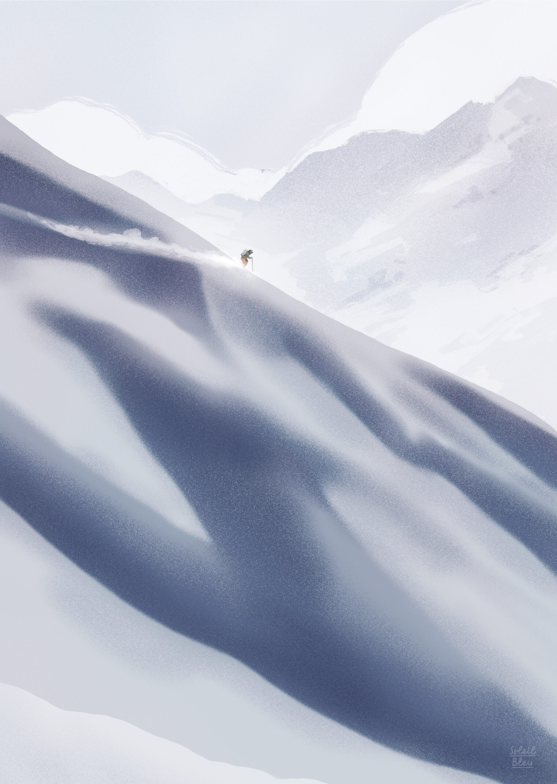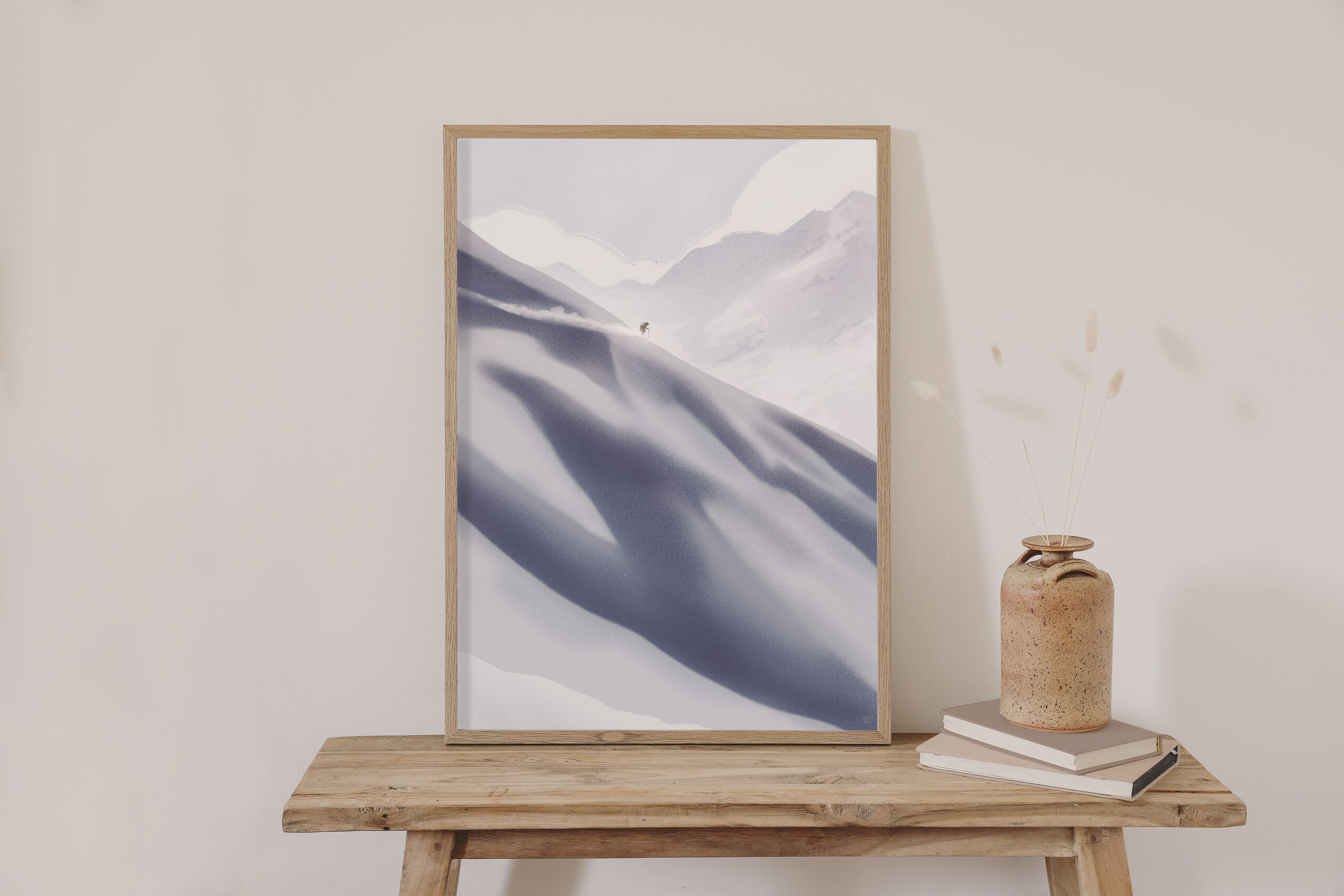 Très belle affiche représentant un skieur hors piste, dans un paysage épuré et sauvage