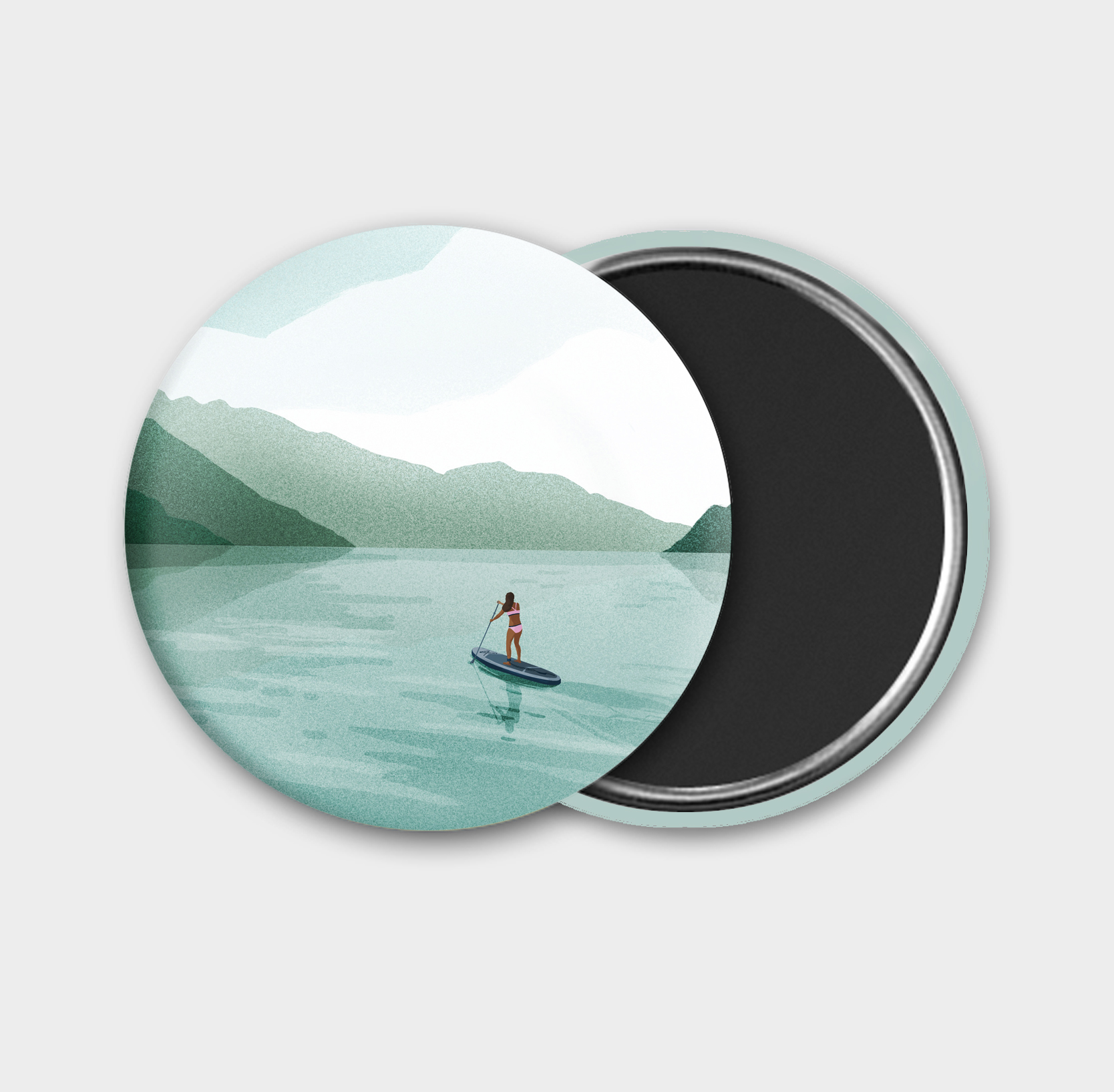 Très belle affiche représentant une femme faisant du Paddle sur un lac dans un paysage épuré et sauvage