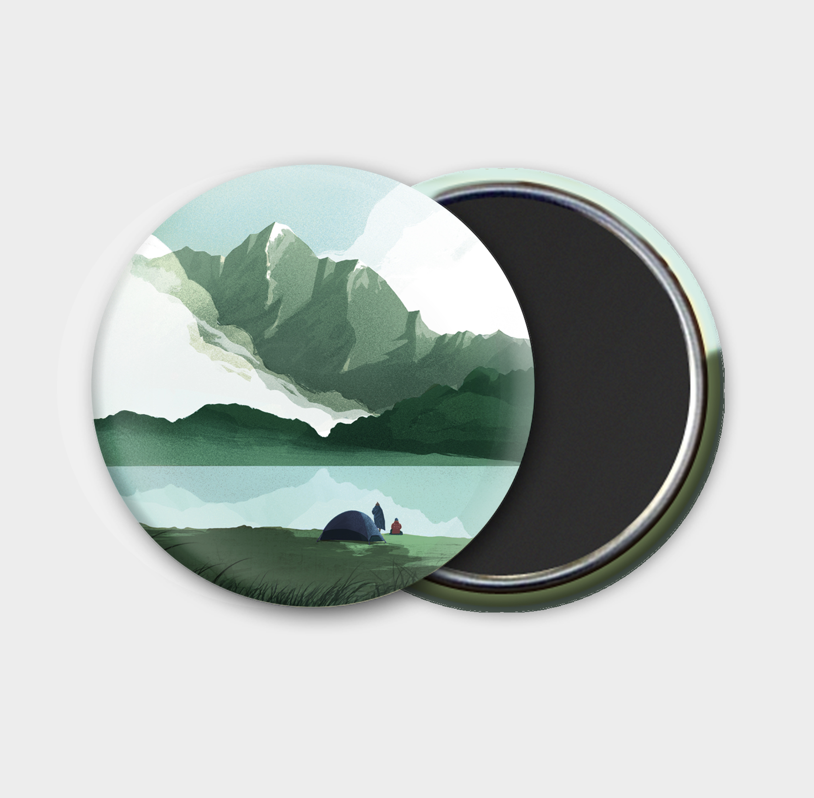 Très belle affiche représentant un bivouac au bord d’un lac de montagne, dans un paysage épuré et sauvage