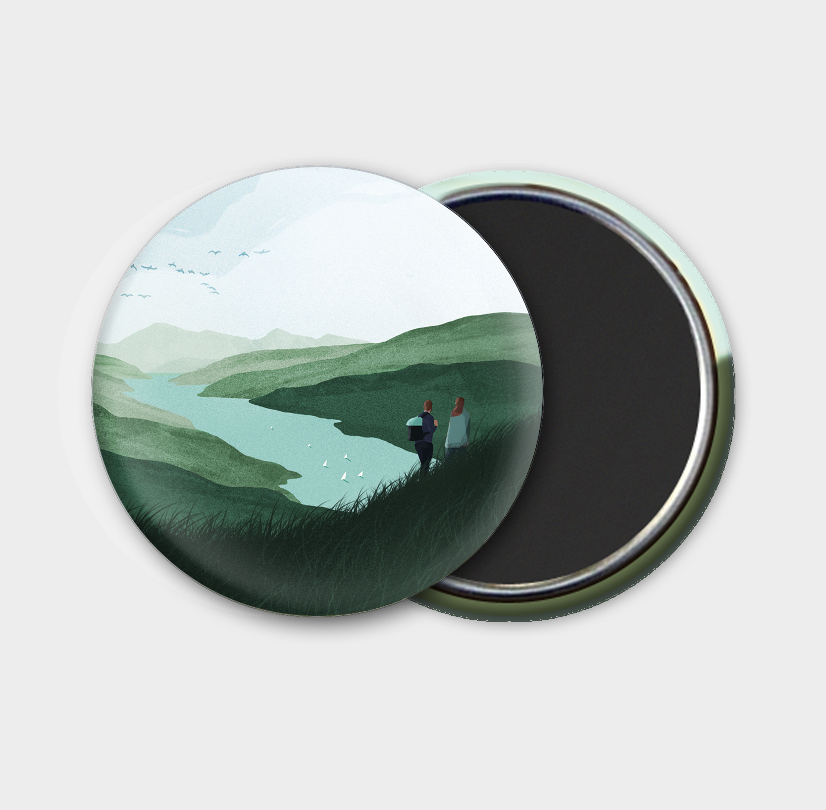 Très belle affiche représentant deux randonneurs admirant le lac de serre ponçon dans un paysage épuré et sauvage